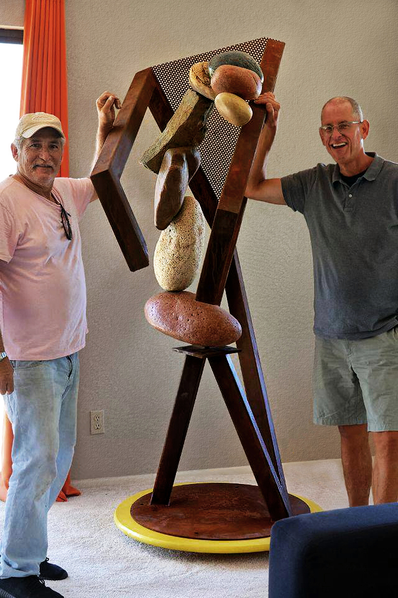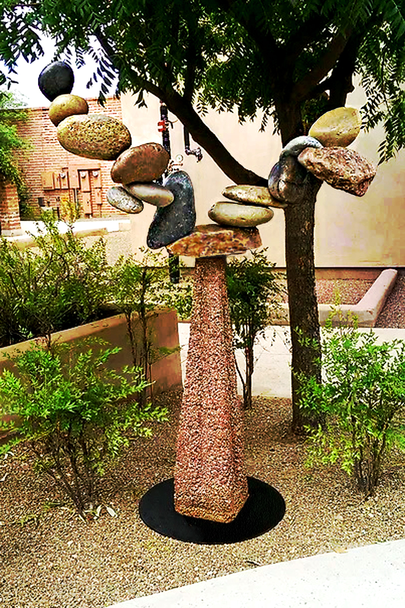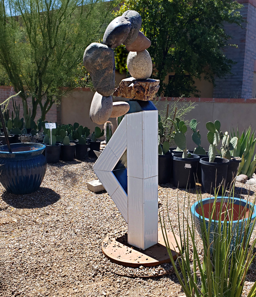 Unique rock sculptures assembled of stone, steel and cement materials. Sculptures are often adjustable, allowing top assembly to swivel 360°. Rock sculptures are based on principles of balance and aesthetics.